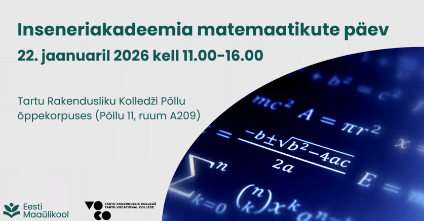 Eesti Maaülikool ja Tartu Rakenduslik Kolledž (VOCO) kutsuvad teid 22. jaanuaril 2026 kell 11.00-16.00 VOCO Põllu õppekorpusesse (Põllu 11A, ruum A209) Inseneriakadeemia matemaatikute päevale.